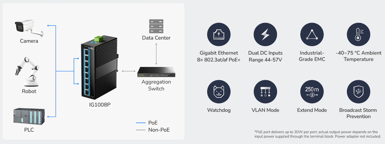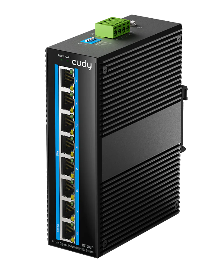 Industrijsko PoE stikalo z 8× gigabitnimi Ethernet priključki, namenjeno omrežnemu povezovanju v zahtevnih okoljih, kot so proizvodnja, transport, pomorstvo, naftna in plinska industrija ter rudarstvo.