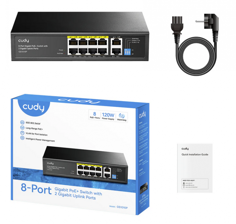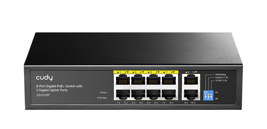 10-gigabitni PoE stikalo z napajalnikom moči 120 W in tiho, pasivno hlajenim sistemom je zasnovano za zanesljivo omrežno povezovanje. Opremljeno je z neodvisnimi stikali za način Extend, VLAN in PoE Watchdog, kar omogoča enostavno upravljanje ter večjo stabilnost priključenih naprav.