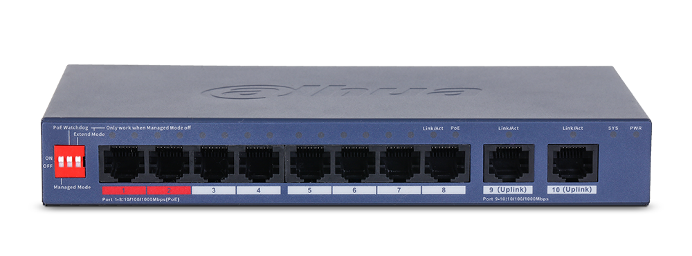 • 8 × RJ-45 Gigabit PoE priključkov, 2 × RJ-45 Gigabit priključka (uplink)