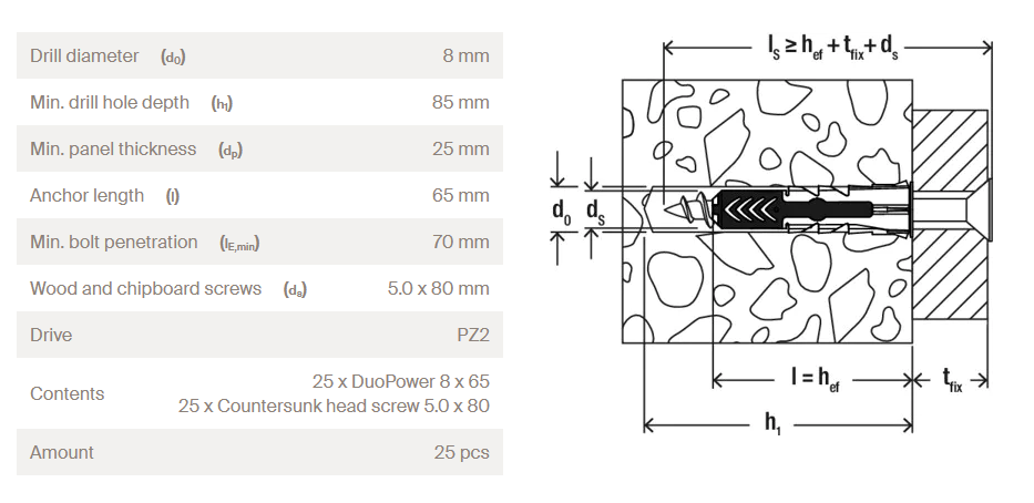 Vsebina: 25 x DuoPower 8 x 65; 25 x Vijak z ugreznjeno glavo 5.0 x 80