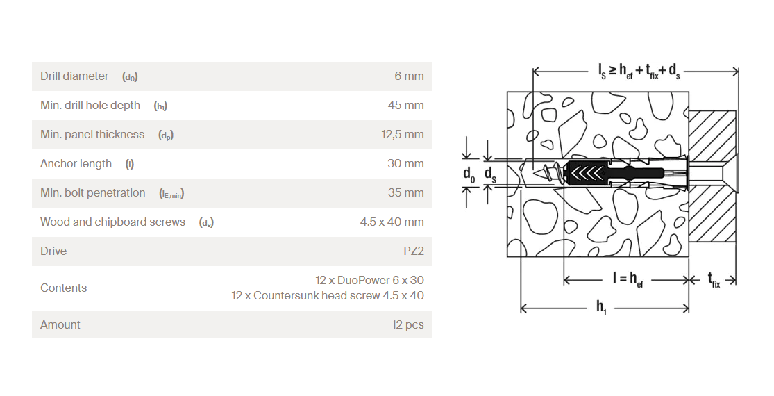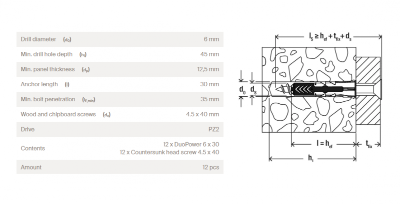 • Minimalna debelina plošče (dₚ): 12,5 mm