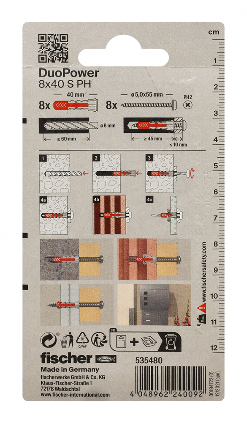 • Večja sidrna globina modelov DuoPower 6 x 50, 8 x 65 in 10 x 80 omogoča uporabo v votlih gradbenih materialih, poroznem betonu in za premostitev ometa.