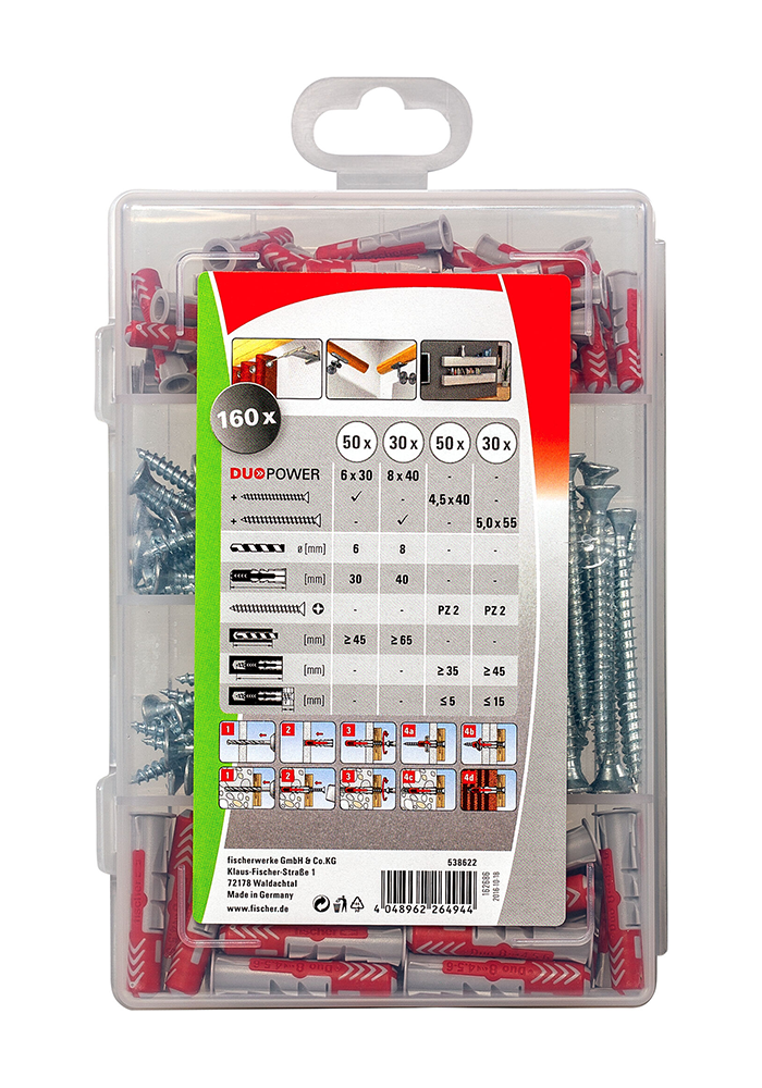Praktična škatla vsebuje izbran asortiment vložkov, vijakov za najpogostejše vrste pritrjevanja.