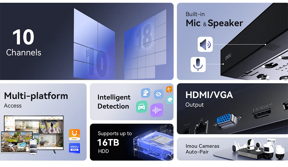 N110 podpira dostop do 10 kanalov. Vgrajena mikrofona in zvočnik omogočata dvosmerno glasovno komunikacijo brez potrebe po dodatni zvočni opremi. Podpira samodejno seznanjanje IMOU kamer, kar omogoča hitrejšo in enostavnejšo povezavo kamer z NVR. N110 ima HDMI in VGA video izhod ter je združljiv z večino zaslonov na trgu. Omogoča dostop prek aplikacije, s katero lahko uporabniki NVR upravljajo od kjerkoli.