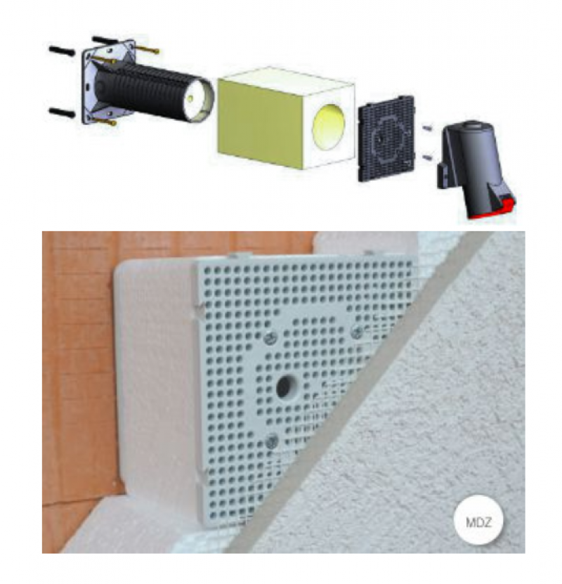 - Za vgradnjo električnih naprav (zunanje luči, senzorji gibanja, 400V vtičnice, itd.) v termično izloriane gradbene fasade z debelino od 50 do 200mm.