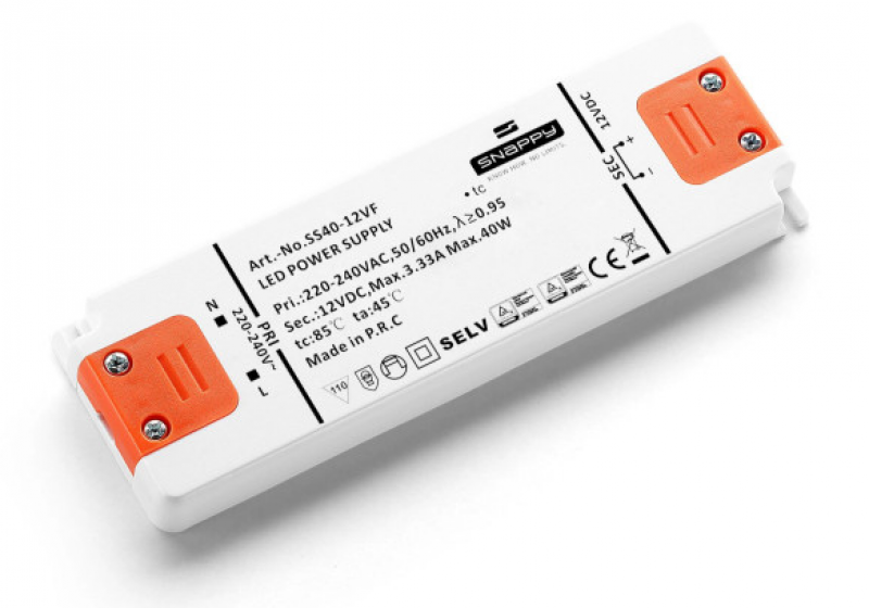 Napajalnik SS40-24VF proizvajalca Snappy, je namenjen predvsem napajanju LED trakov, LED žarnic, LED sijalk, LED modulov in ostalih LED svetil, ki za delovanje potrebujejo napajanje s konstantno napetostjo. Snappy kompaktni napajalniki za LED so zaradi oblike in kompaktnih dimenzij primerni za vgradnjo v najrazličnejša ohišja, kjer je pomanjkanje prostora. Zaradi ustreznosti varnostnim standardom jih lahko montiramo tudi neposredno na leseno pohištvo in druge vnetljive materiale.