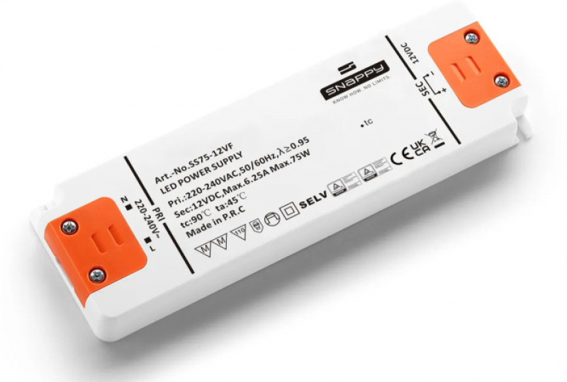 Napajalnik SS75-24VF proizvajalca Snappy, je namenjen predvsem napajanju LED trakov, LED žarnic, LED sijalk, LED modulov in ostalih LED svetil, ki za delovanje potrebujejo napajanje s konstantno napetostjo. Snappy kompaktni napajalniki za LED so zaradi oblike in kompaktnih dimenzij primerni za vgradnjo v najrazličnejša ohišja, kjer je pomanjkanje prostora. Zaradi ustreznosti varnostnim standardom jih lahko montiramo tudi neposredno na leseno pohištvo in druge vnetljive materiale.