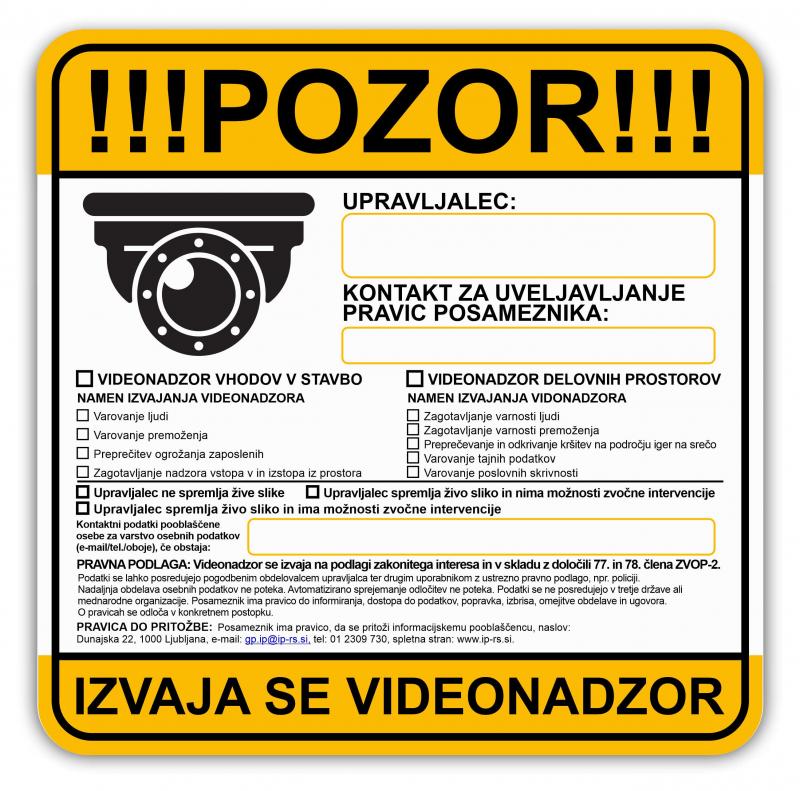 Samolepilna PVC nalepka skladna z novim zakonom ZVOP2, odporna na vremenske vplive.