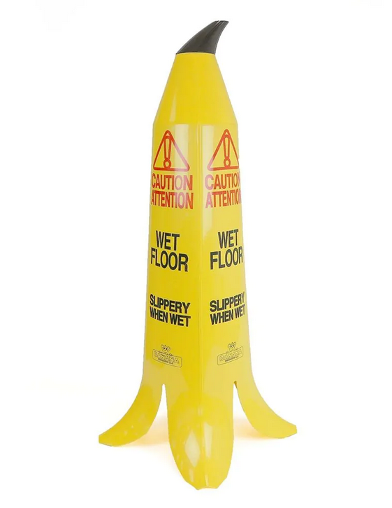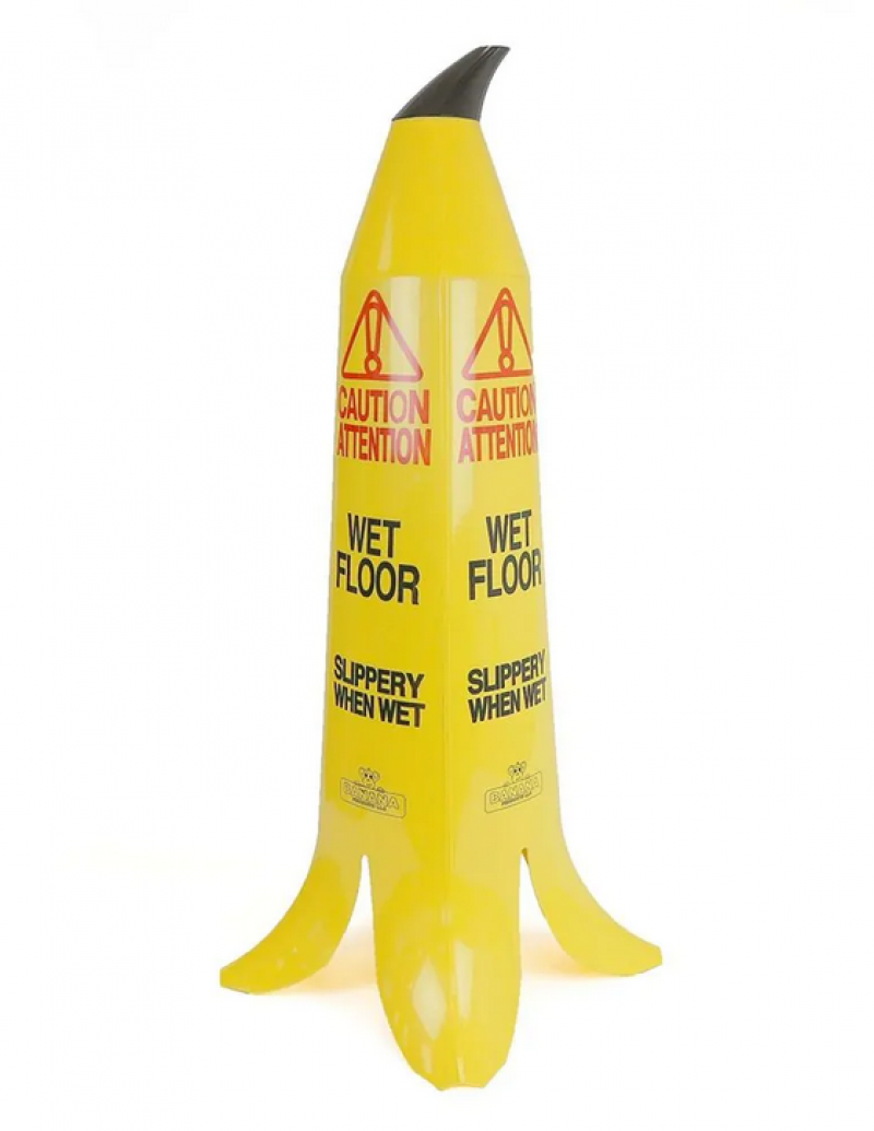 Opozorilni znak za tla, ki so spolzka, ko so mokra. Spolzka tla predstavljajo pomembno tveganje, če ljudje nanj niso opozorjeni. Ta stožec v obliki bananine lupine izstopa in zagotovo bo vsem, ki ga vidijo, izzval nasmeh.