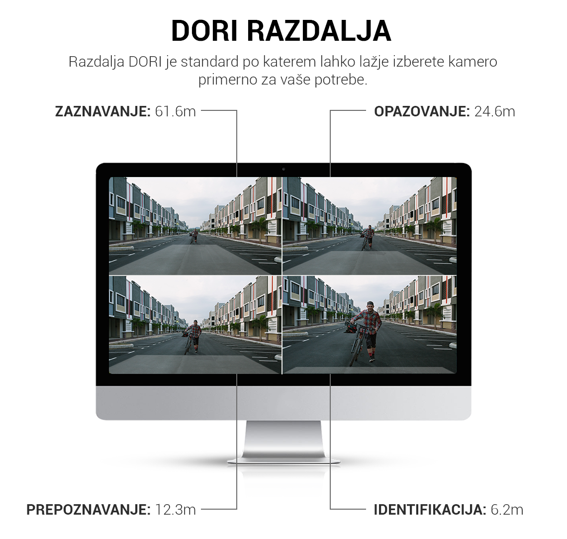 *DORI (Detect, Observe, Recognize, Identify) je standardni sistem (EN-62676-4) za določanje zmožnosti osebe, ki gleda video, da razlikuje osebe ali predmete znotraj pokritega območja.