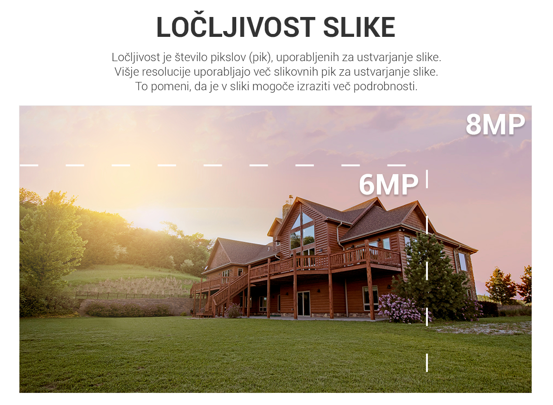 Ločljivost: 8M (3840 × 2160); 6M (3072 × 2048); 5M (3072 × 1728); 4M (2880 × 1620/2688 × 1520); 3M (2048 × 1536/2304 × 1296); 1080p (1920 × 1080); 1.3M (1280 × 960); 720p (1280 × 720); D1 (704 × 576/704 × 480); VGA (640 × 480); CIF (352 × 288/352 × 240)