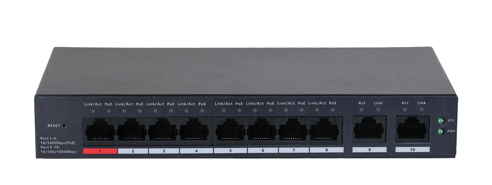 Opis funkcijskih rež: Vrata 1-8: 8 × RJ-45 10/100 Mbps (PoE); Vrata 9-10: 2 × RJ-45 10/100/1000 Mbps (navzgornja povezava)