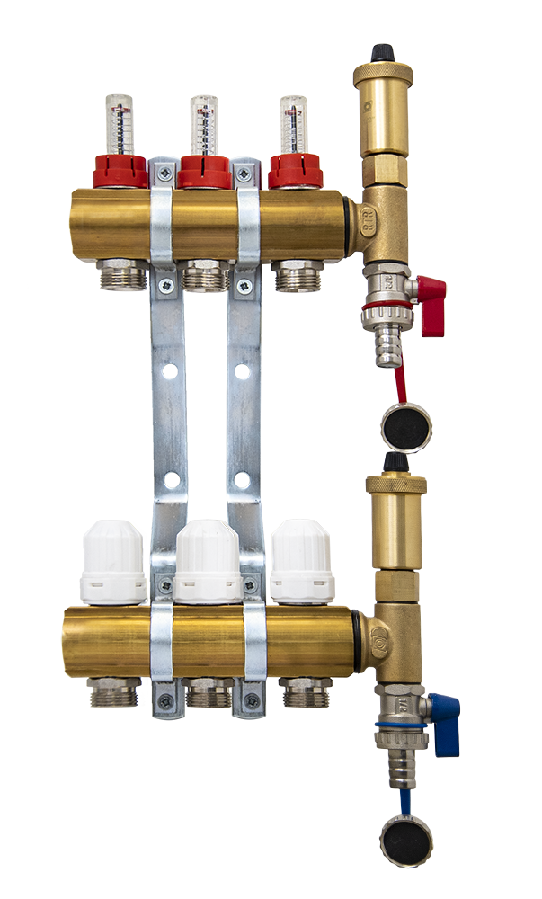 Razdelilec sestavlja: dovodni razdelilec z regulacijskimi ventili (z merilnikom pretoka), odvodni razdelilec z regulacijski ventili (ročni) z možnostjo zategovanja, T člen, polnilna pipa, nosilca