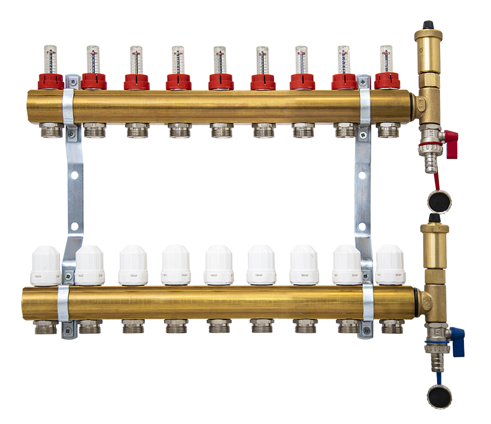 Razdelilec sestavlja: dovodni razdelilec z regulacijskimi ventili (z merilnikom pretoka), odvodni razdelilec z regulacijski ventili (ročni) z možnostjo zategovanja, T člen, polnilna pipa, nosilca