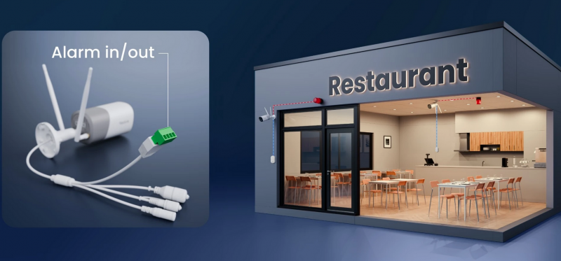 Kamera omogoča povezavo z zunanjimi napravami prek alarmnega vhoda in izhoda (do 12 V / 1 A vhod, 12 V / 500 mA izhod), kar omogoča napredne varnostne scenarije.