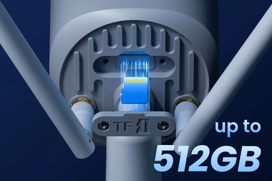 8 MP (3840 × 2160) – 30 fps / Motorizirana leča 108°–32° + 5× optični zoom / Nočni domet do 30 m + barvni nočni vid / Vgrajen mikrofon in zvočnik – dvosmerni zvok / Zaznavanje ljudi, vozil, živali in paketov + IVS / microSD do 512 GB / Wi-Fi povezava / Brezplačna aplikacija za telefon