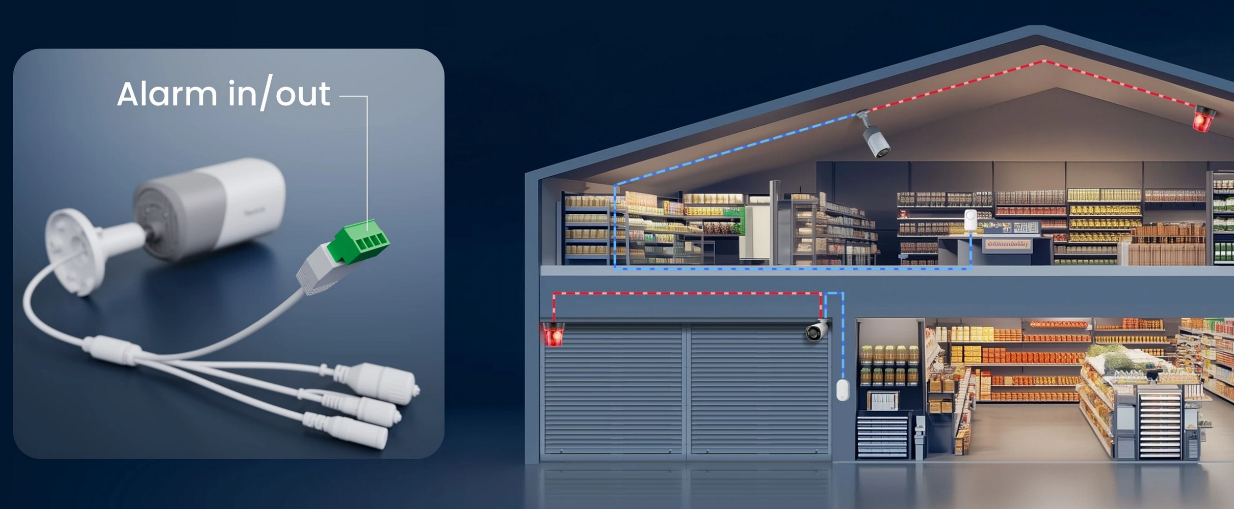 Sistem vključuje en alarmni vhod in en alarmni izhod, kar omogoča povezavo z zunanjimi napravami, kot so senzorji, zvočniki ali opozorilne luči. Podpira do 12 V / 1 A za vhod in 12 V / 500 mA za izhod, kar zagotavlja zanesljivo in odzivno delovanje v naprednih varnostnih sistemih.