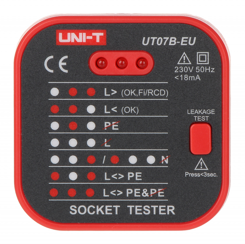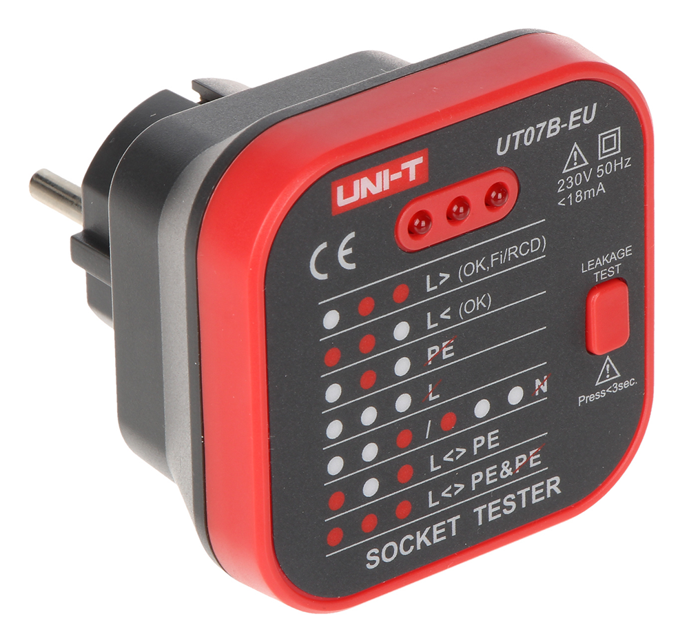 Tester UT07B-EU prikazuje pravilnost priključitve vodov L, N, PE v električni vtičnici. Poleg tega ima funkcijo preizkušanja učinkovitosti delovanja diferenčno-tokovnih izklopnih naprav RCD.